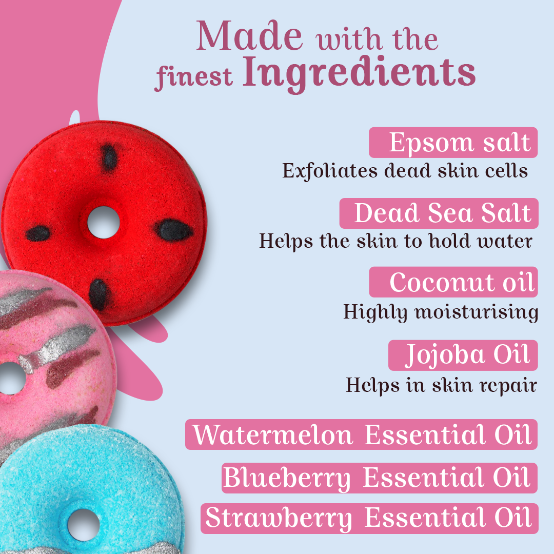 Like your favourite donuts but they bring you happiness in the shower! 3 fragrances to suit your mood, however you feel. Make your skin shine in style with our Donut Bath Bomb!