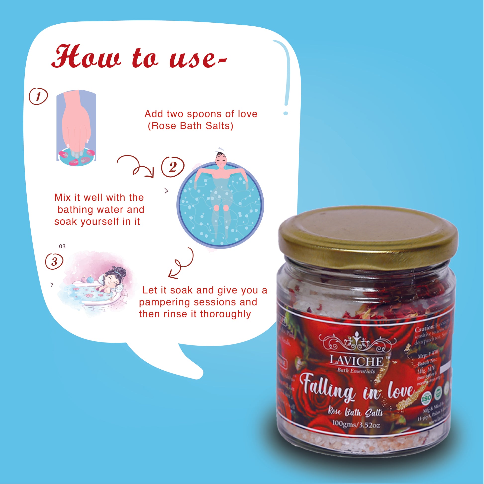 Add three spoons of love (Rose Bath Salts) to lukewarm water and massage it well. Let it settle in and give your body and feet pleasant pampering session. Rinse it well for smooth skin.