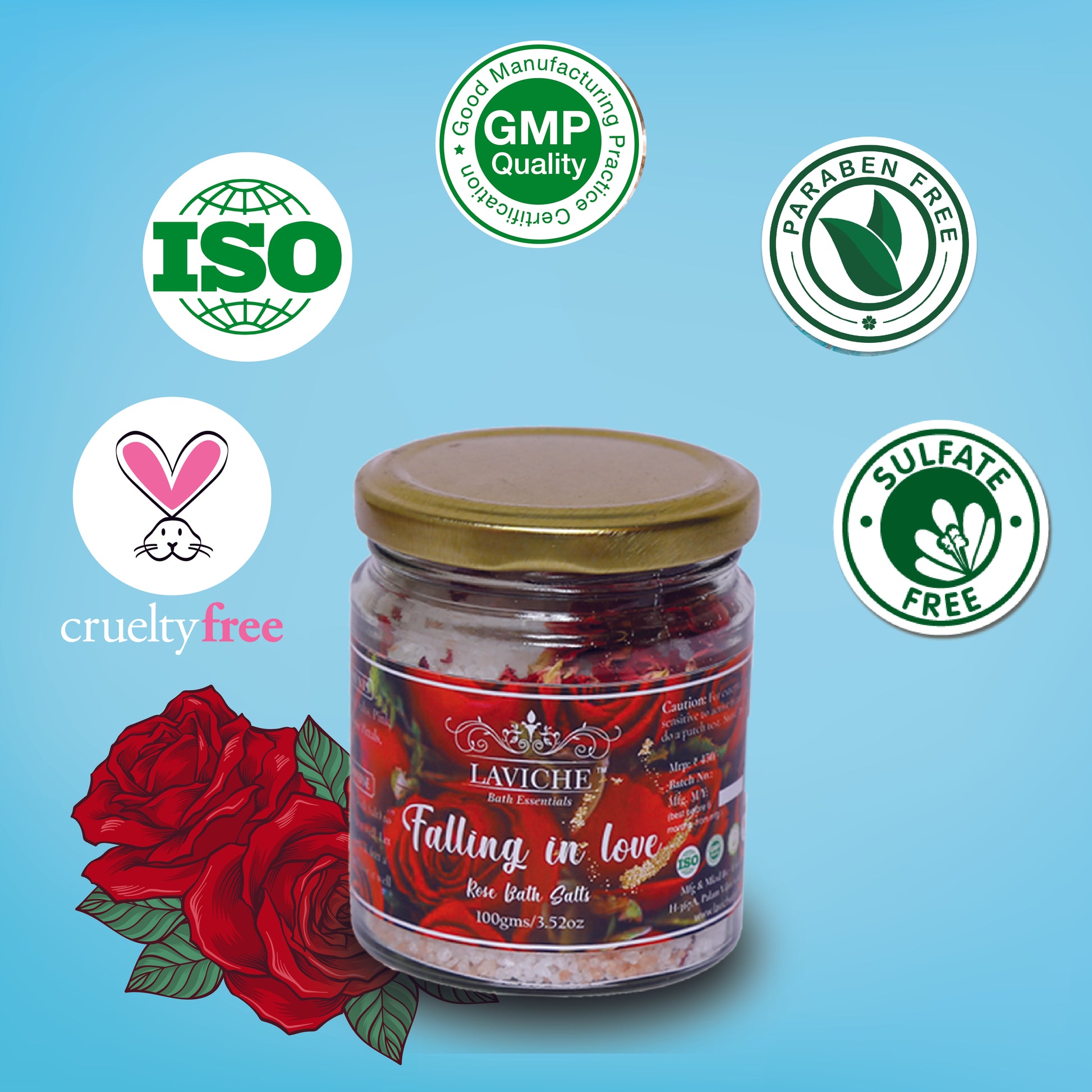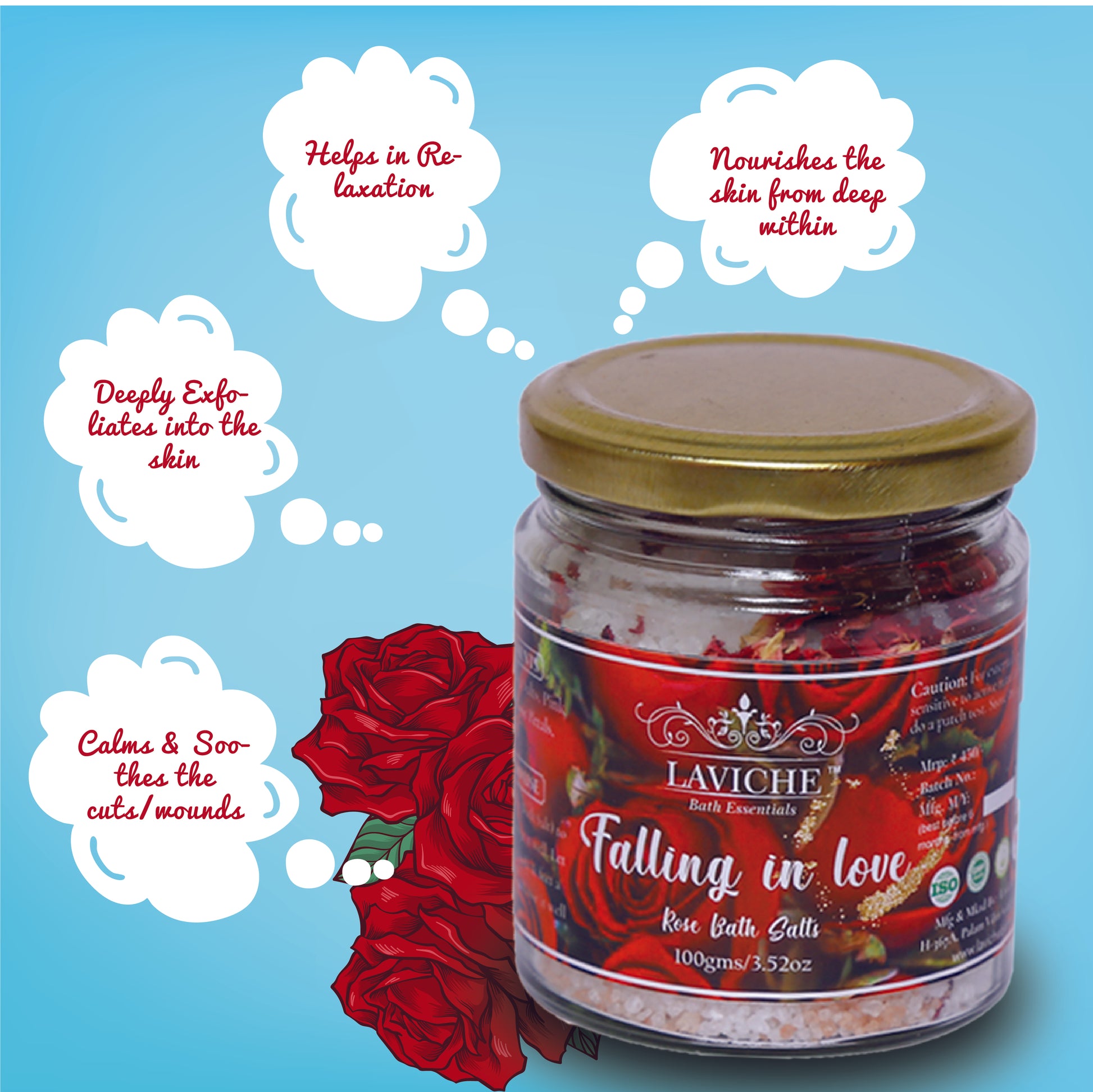 Soaking yourself in the Laviche bath salts will remove the toxins and also give relief to your sore muscles. Rose essential oil has tension relieving properties that can soothe an overworked body and also help you sleep better. Rose oil has a very calming effect and can lift your mood.