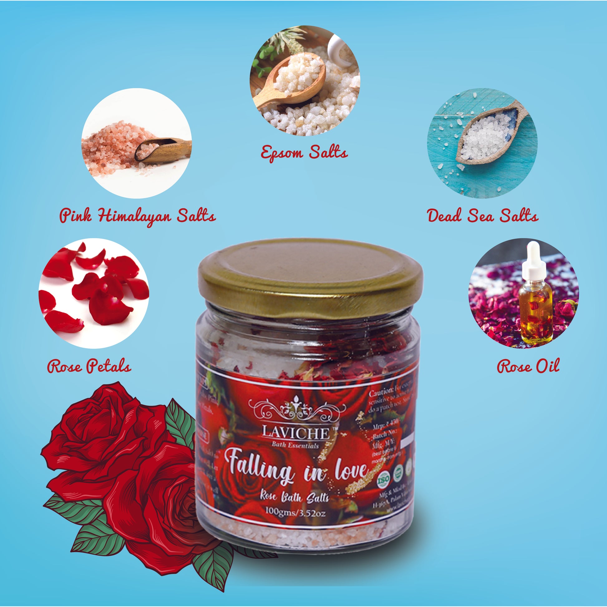 Epsom Salts, Dead Sea Salts, Pink Himalayan Salts, Rose Petals, Rose Oil.