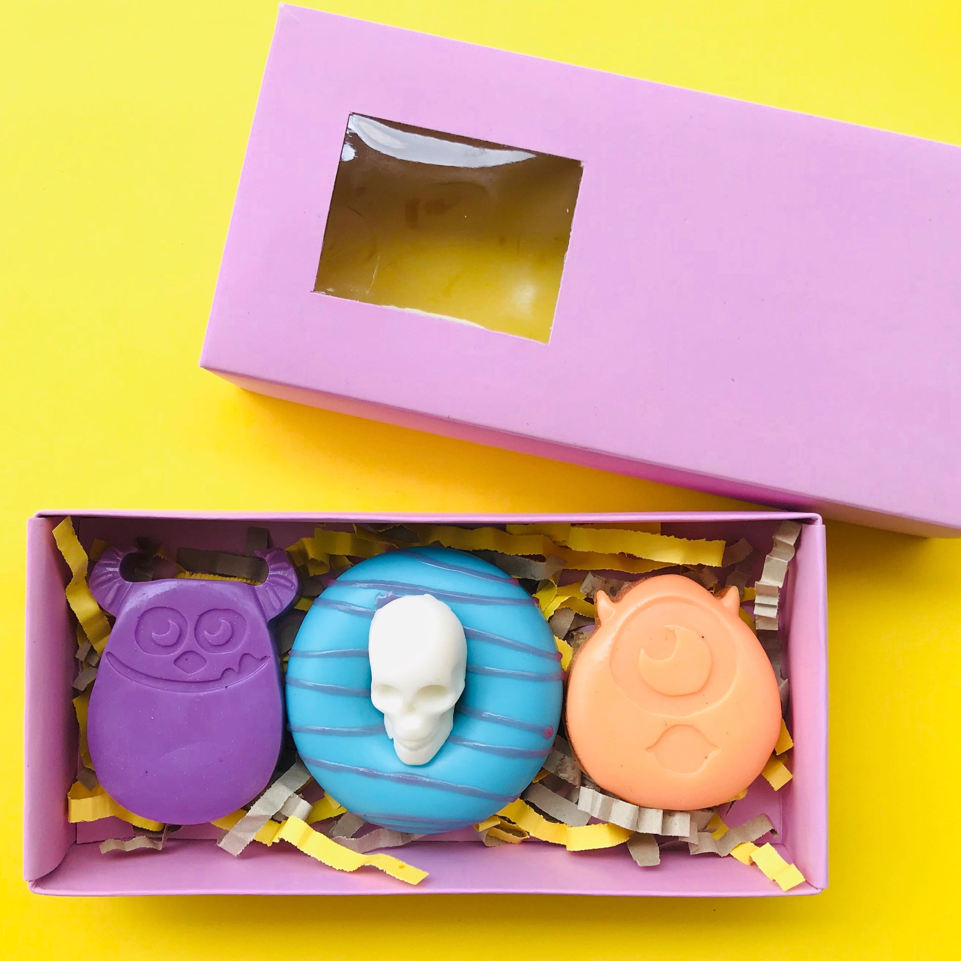 1 Blue Skull Donut Soap, 1 Purple Monster Soap, 1 Orange Monster Soap, Box Packing