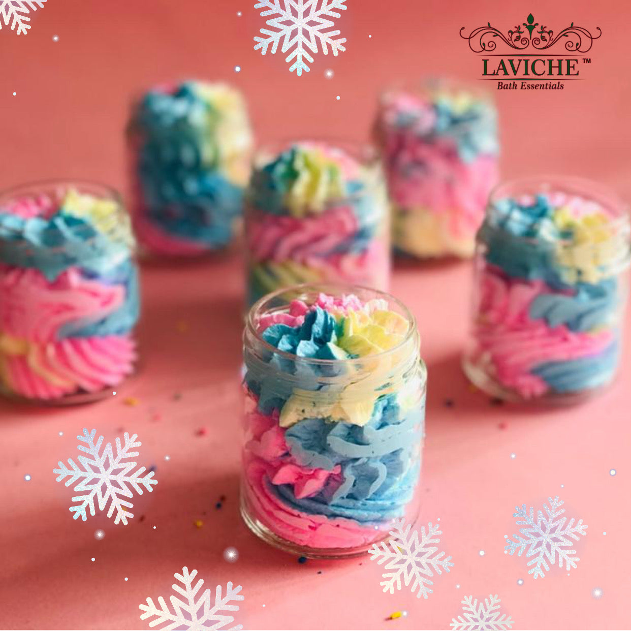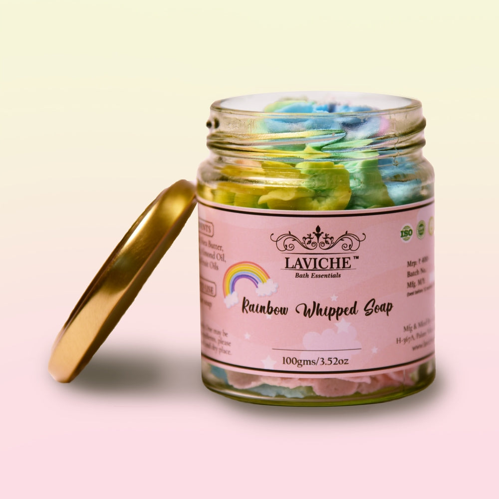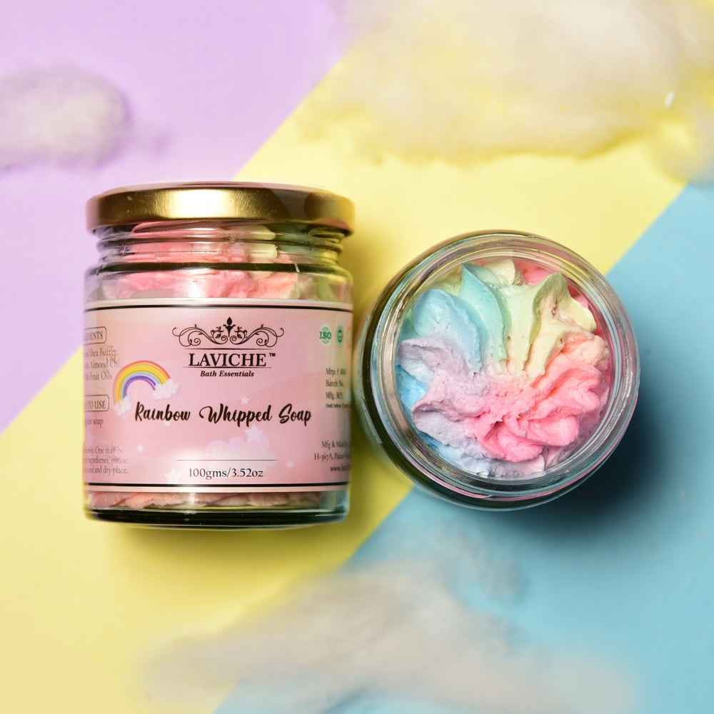 Indulge in a luxurious bathtime with our dreamy rainbow whipped soap! This dreamy and wonderful Rainbow Fluffy Whipped Soap is so creamy, it leaves your skin smooth and squeaky clean.